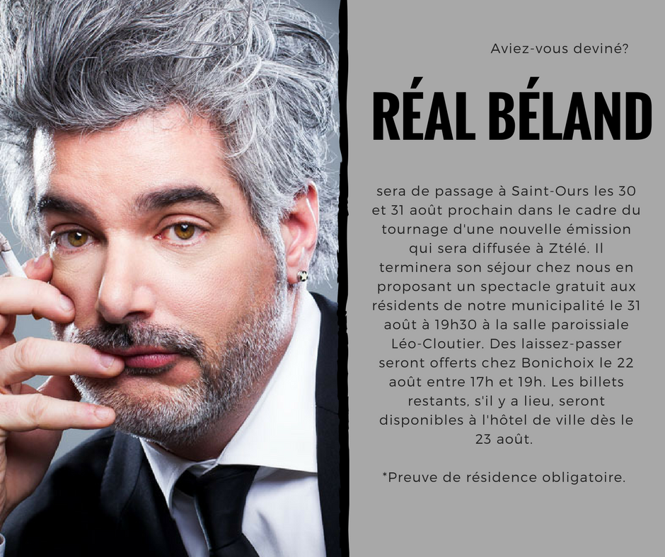 L’humoriste Réal Béland sera la personnalité de passage à St-Ours pour le tournage d’une toute nouvelle émission de Z Télé, « Comédie sur mesure », les 30 et 31 août prochain.