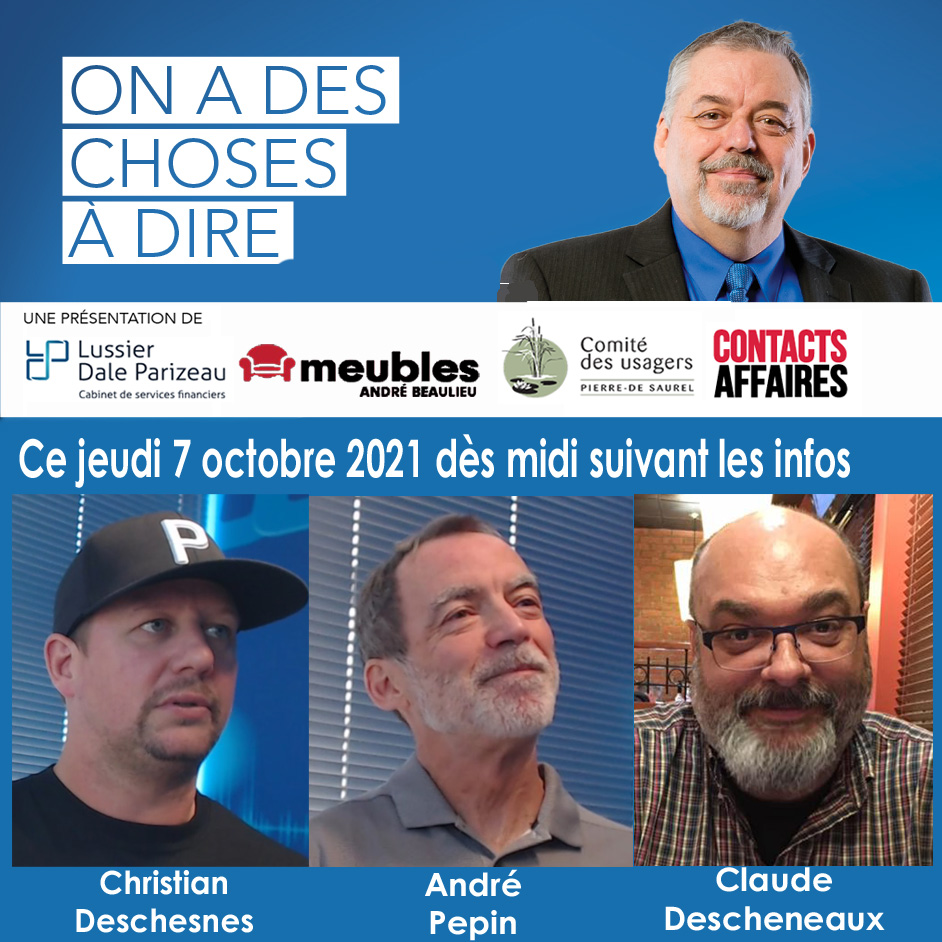 Ce jeudi nous recevons Christian Deschesnes des Éperviers de Sorel-Tracy qui reprennent officiellement leurs activités ce vendredi au Colisée Cardin avec le premier match de la saison 2021-2022. André Pepin de la CENAP (Coalition Eau Nature Air Pur) qui nous invite à la Grande marche pour la protection des forêts le 16 octobre prochain au Parc régional des grèves. Dans le cadre de la Semaine de la sensibilisation aux maladies mentales on rencontre Claude Descheneaux de la ressource le Vaisseau d’or qui nous rappelle le rôle de l’organisme.
