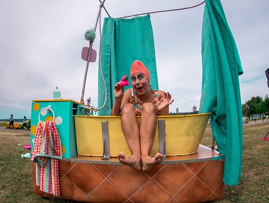 Dans le spectacle Plouf de la compagnie Le Gros Orteil, le 22 juillet, à 10h30, nous ferons la connaissance de Linda Babin, au petit matin, alors qu’elle se prépare dans sa salle de bain, à demi endormie. Nous serons témoin des mésaventures loufoques de cette drôle de dame, de la perte de ses lunettes en chutant dans la cuvette, en passant par de périlleuses acrobaties exécutées pour récupérer son savon sur le prélart mouillé ! La présentation du spectacle Plouf ! sera suivie d’un atelier d’initiation au cirque.