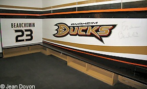 François Beauchemin est resté saisi, disait-il, lorsqu’il fit son entrée dans la chambre. « Il manque juste un gros tapis et on a presque l’impression d’être à ANAHEIM ! », disait-il à la blague. C’est une très belle chambre aux couleurs des Ducks, ça frappe en entrant ! C’est une idée originale qui va peut-être motiver les jeunes en voyant nos noms et les couleurs des Canadiens, des Penguins et des Ducks. C’est un beau geste d’admiration ! »