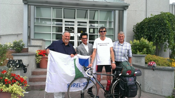 Avant son départ, le maire, Serge Péloquin, lui a remis le drapeau de la Ville de Sorel-Tracy, pour symboliser son passage ici.