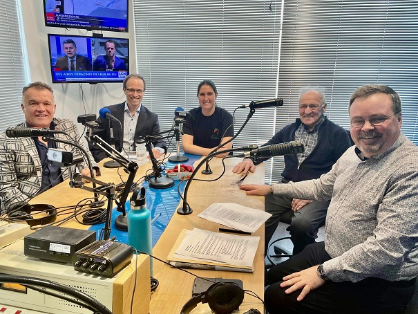 Le Gala du mérite économique a honoré, le 29 avril, plusieurs personnes qui contribuent au développement de la région. Denis Marion s’entretient avec trois des lauréats: Jean-Noël Beauchemin (Grand Bâtisseur), Sylvain Descheneaux (Intervenant économique) et Magalie Rajotte (2 Prix Coup de coeur). Marcel Rainville, directeur du Journal Les 2 Rives et membre du comité organisateur, se joint à eux.