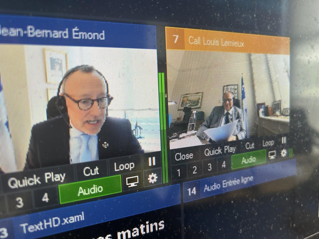 Denis Marion reçoit Jean-Bernand Émond, député de Richelieu, et Louis Lemieux, député de St-Jean et adjoint parlementaire du ministre de la langue française.