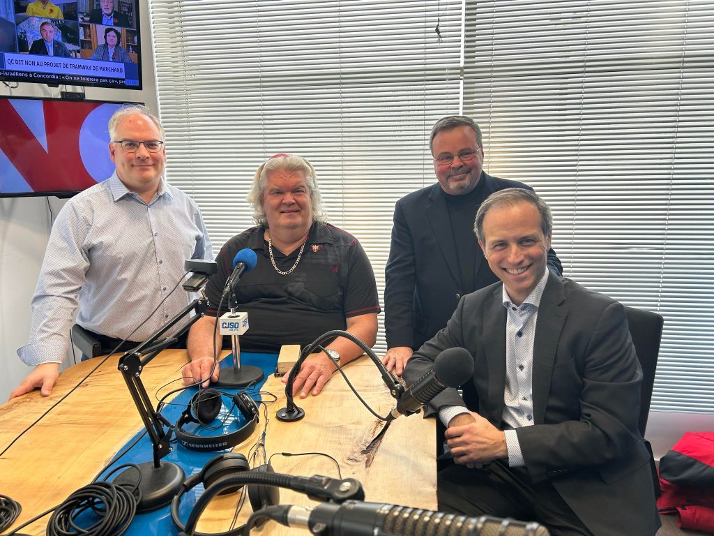 Denis Marion a réuni autour de la table Laurent Cournoyer (CJSO), Jean Doyon (Sorel-Tracy Magazine) et Marcel Rainville (Les 2Rives). Il s’entretient également avec Patrick White, professeur en journalisme à l’UQAM.