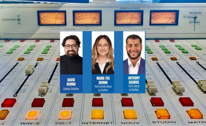 À l’émission La Tribune, ce mardi 13 septembre, Sylvain Rochon recevait, tour à tour, David Dionne de Québec Solidaire, Marie-Ève Dionne du Parti Conservateur du Québec et Anthony Sauriol du Parti Libéral du Québec.