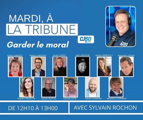 Comment conserver le moral après deux ans d’une pandémie qui n’en finit plus ? Sylvain Rochon reçoit, ce 18 janvier, à La Tribune, Céline Gariépy, Patrick Lamothe, Annie Caissy, Joël Laroche, Jessica Mireault, Alexandre Vovan, Virginie Fredette, Sylvain Dupuis, Chantal Côté, Sylvain Guimond et Micheline Charron.