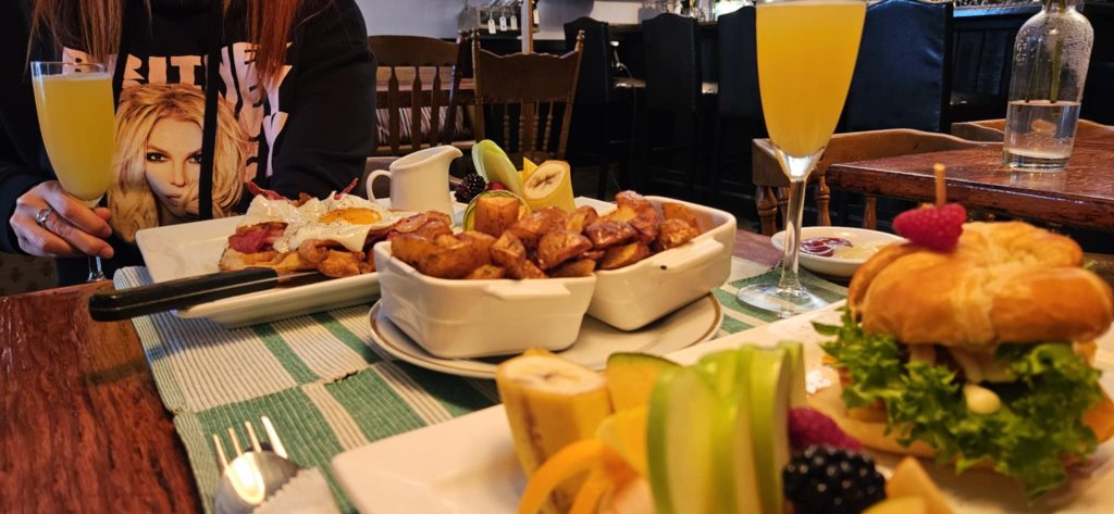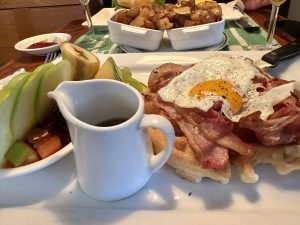 Au menu ce matin-là? Une gaufre moelleuse accompagnée de bacon croustillant (parce que, paraît-il, « ça prend du bacon » et c’est vrai), d’un œuf mirroir, de fruits frais colorés, de vrai sirop d’érable, de succulentes patates rôties bien assaisonnées et, évidemment, d’un café bien chaud. Le tout agrémenté d’un mimosa pétillant parce qu’on te pose la question dès ton arrivée : « Mimoses-tu? » Une façon joyeuse de commencer le week-end en douceur!