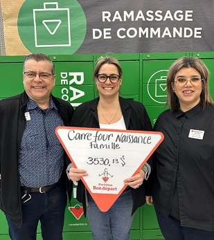 Le Carrefour naissance-famille salue le don offert par la Fondation Bon départ Canadian Tire. Grâce au propriétaire et au directeur de la succursale de Sorel-Tracy, Dominique Pressault et Steves Savard, l’organisme se voit remettre 3 530, 13 $, montant qu’il investira dans sa salle de conférence et sa cuisine et l’achat d’un chariot et d’un abri-soleil pour ses activités extérieures. Julie Naud, directrice générale du Carrefour, exprime sa gratuitude à la Fondation pour son appui, essentiel au renforcement des services et à l’adaptation des espaces aux besoins des usagers. Le Carrefour naissance-famille est un organisme communautaire qui soutient les familles de la MRC de Pierre-de-Saurel depuis 40 ans. Il leur propose un accompagnement sur mesure, de la périnalité à l’adolescence.