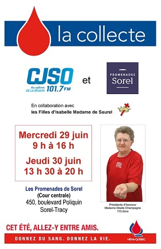 Une collecte de sang sera organisée ce mercredi 29 juin, aux Promenades de Sorel, en collaboration avec CJSO 101,7FM et les Filles d’Isabelle Madame de Saurel.