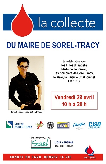 Une collecte de sang se tiendra le vendredi 29 avril prochain entre 10 h et 20 h à la Cour centrale des Promenades de Sorel et le Maire de Sorel-Tracy Serge Péloquin, les Filles d’Isabelle Madame de Saurel, les pompiers de Sorel-Tracy, Maxi, la Laiterie Chalifoux et CJSO 101,7fm invitent les gens à y participer.