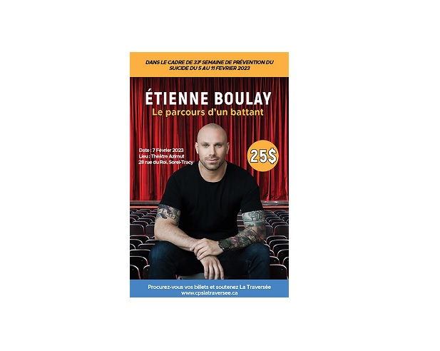 Dans le cadre de la Semaine de prévention du suicide, La Traversée nous convie, mardi soir, 18h, au Marché des arts Desjardins, à une conférence d’Étienne Boulay. Ce n’est pas sur le terrain qu’Étienne Boulay livrera sa plus grande bataille. Aux prises avec les effets secondaires de ses commotions cérébrales, un divorce difficile et de graves problèmes de consommation qu’il cache à son entourage et sa famille, il vivra une période extrêmement sombre et fera une tentative de suicide avant de se soumettre à sa troisième thérapie, qui lui permettra enfin de voir la lumière au bout du tunnel. Des billets pour la conférence d’Étienne Boulay seront toujours disponibles à la porte au coût de 25 $. On peut aussi s’en procurer sur le site WEB de La Traversée https://www.cpslatraversee.ca/