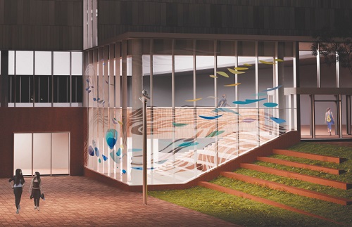 La Ville de Sorel-Tracy a dévoilé la maquette de l’œuvre qui sera réalisée sur l’ensemble de la fenestration du futur complexe aquatique. Les pas de l’eau, l’œuvre choisie, est une création de l’artiste Sébastien Worsnip qui utilise l’impression numérique à l’encre céramique. Sa création sera ensuite fusionnée au verre des parois du bâtiment. Évoquant la vitalité et le dynamisme de l’eau, cette réalisation artistique captera l’attention des visiteurs au premier regard lorsqu’ils découvriront l’édifice.