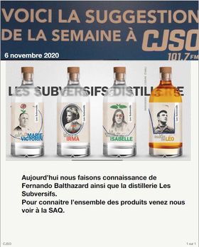 Doris Pettigrew est accompagnée de Fernando Balthazard, co-propriétaire de la distillerie Les Subversifs de Sorel-Tracy, qui vient présenter sa gamme de produits.