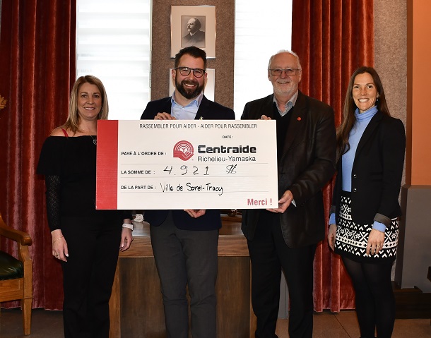 La Ville de Sorel-Tracy remet à Centraide Richelieu-Yamaska un chèque de 4 921 $ dans le cadre de sa campagne de financement annuelle. Cette somme sera redistribuée à des organismes communautaires de la région qui viennent en aide aux personnes plus démunies.